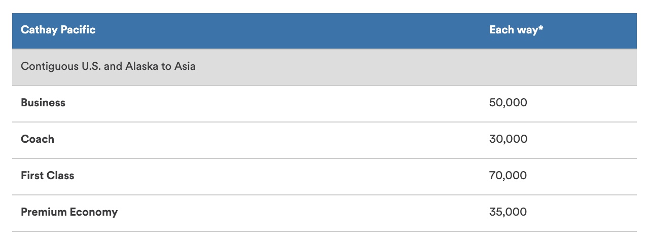 Let’s start with my absolute favorite, flights between the U.S. and Asia on Cathay Pacific. You can fly in first class for only 70,000 miles each way, or for 50,000 miles in business class. Even 30,000 miles each way in coach is not half bad, and you’ll see that Cathay Pacific is one of the few airlines that makes it easy to redeem for premium economy awards.