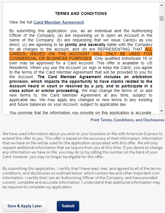” … ALL CARD(S) ISSUED ON THE ACCOUNT WILL ONLY BE USED FOR COMMERCIAL OR BUSINESS PURPOSES …”