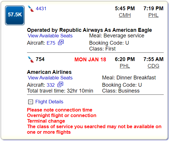 As you can see, you can reserve a flight from the U.S. to Paris in fancy business class for just 57,500 American Airlines miles one-way.