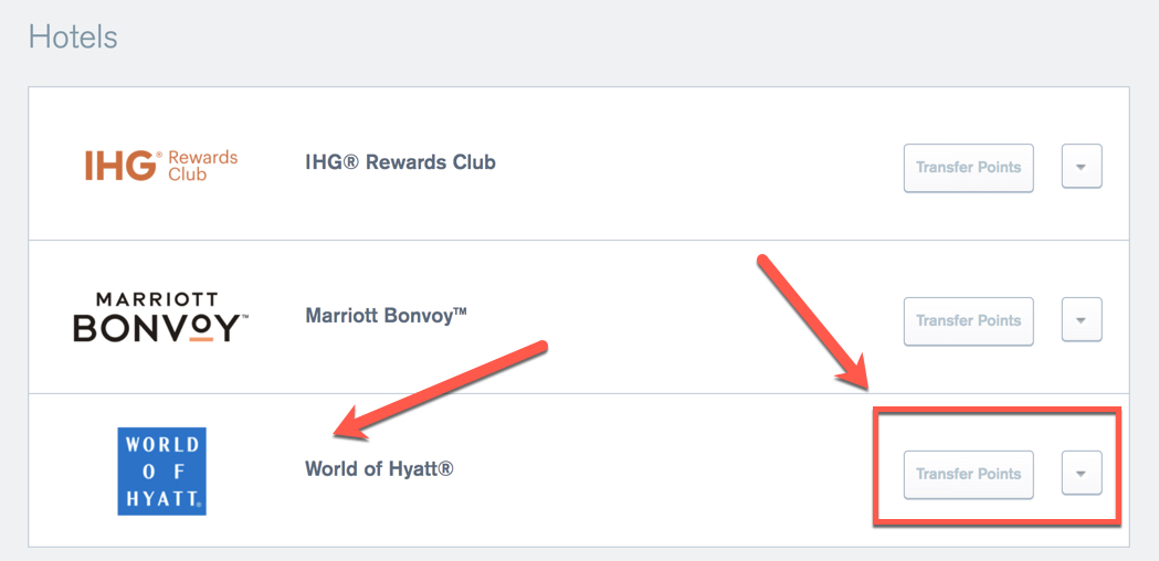 Then, scroll down to the hotel transfer partner section. Next to Hyatt, click “Transfer Points.”